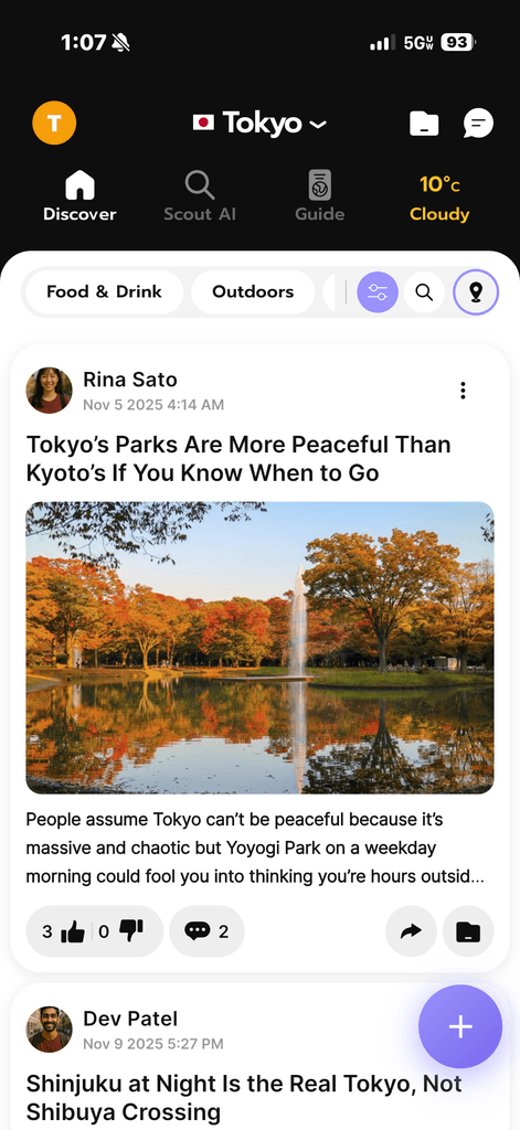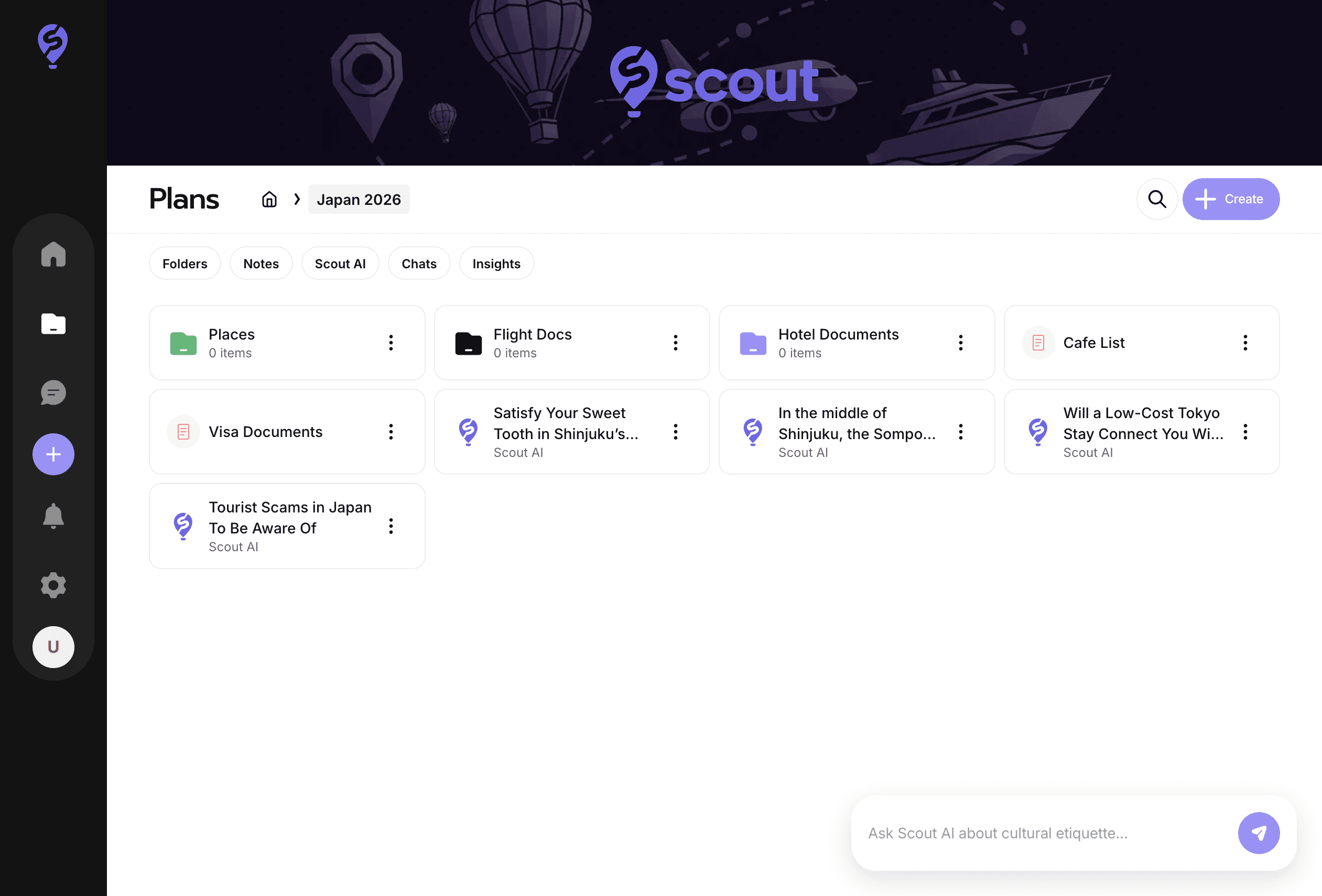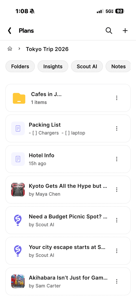 Plans is like Google Drive for travel planning. It helps you organize Insights, Scout AI threads, and city chats. Use Notes (within Plans) to keep track of packing lists, flight and hotel itineraries, or anything else.